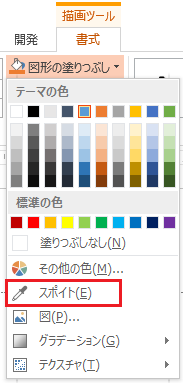 塗りつぶしの色を変更する図形を選択し、描画ツール の 書式 タブの図形のスタイル グループの 図形の塗りつぶし の をクリックし、スポイト をクリックします。 マウス ポインターに色を表示する四角形が表示されます。